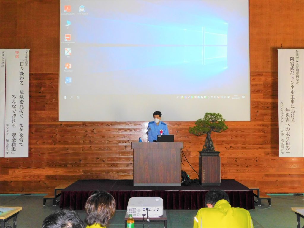 また、弊社職員による作業所安全管理事例発表では現場所長である橋本が「阿宮武部トンネル工事における無災害への取り組み」という題目で作業所で実施した様々な安全衛生管理の事例を発表いたしました。