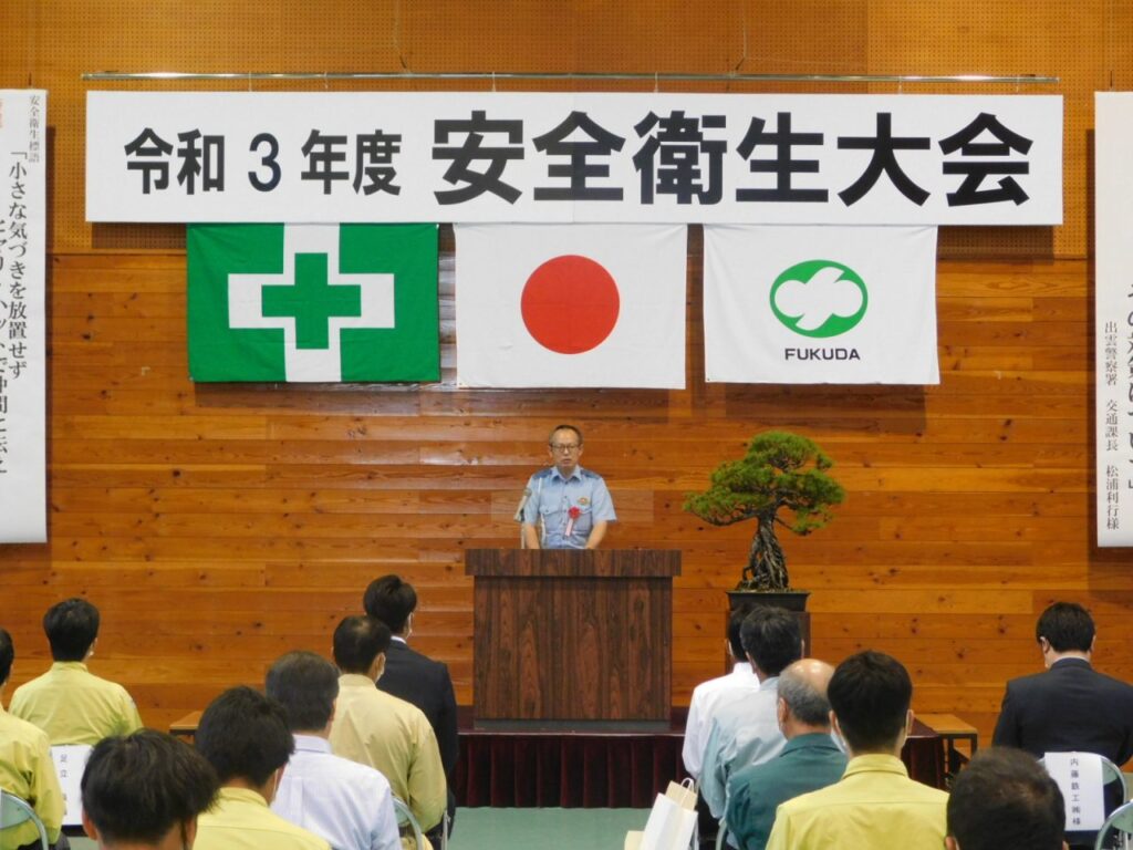 交通安全指導では、島根県出雲警察署交通課長 松浦利行様に「交通事故の情勢とその対策について」という題目でご講演いただきました。そして、最後は高橋副会長が代表して大会宣言を行いました。今後も更なる安全衛生ならびに交通安全に関する取り組みを展開してまいります。
